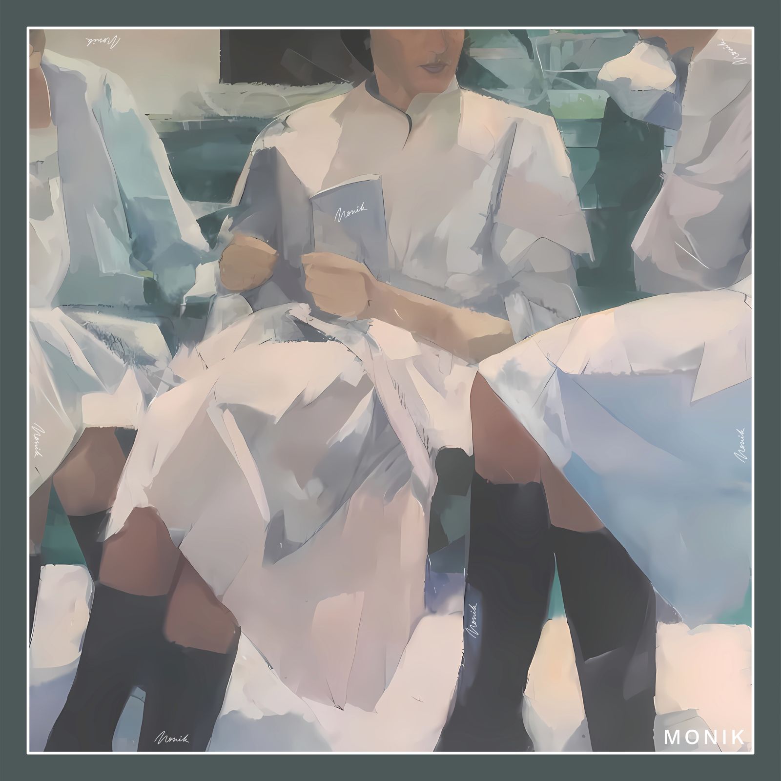 Handcrafted in 100% silk satin with a lustrous finish, it is framed by a delicate border and discreetly signed with the MONIK logo, a wearable artwork that transforms memory into motion.